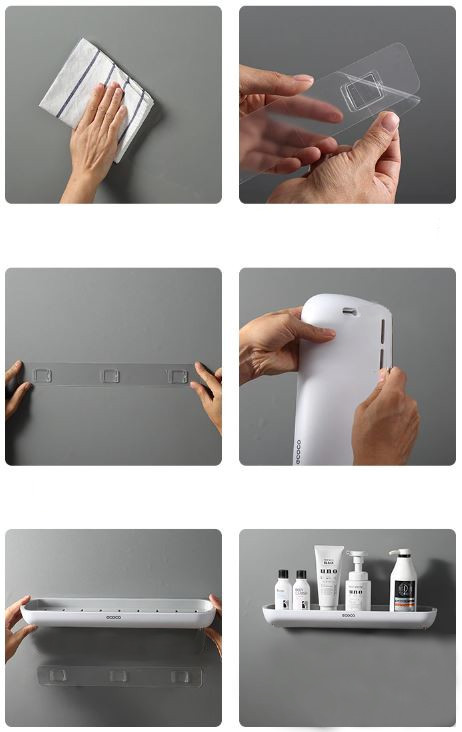 Wystarczy oczyścić ścianę gdzie mają być półki, następnie przykleić dołączony, samoprzylepny plaster z uchwytami i na niego wsunąć od góry półkę, to tyle! 🙂