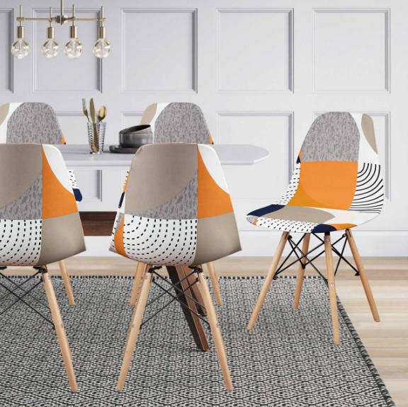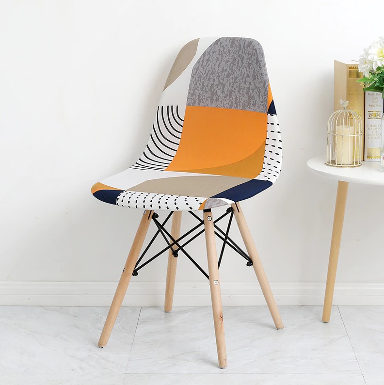 ZESTAW CZTERECH ELASTYCZNYCH JEDNOCZĘŚCIOWYCH POKROWCÓW NA KRZESŁO SKANDYNAWSKIE POMARAŃCZOWO-SZARE