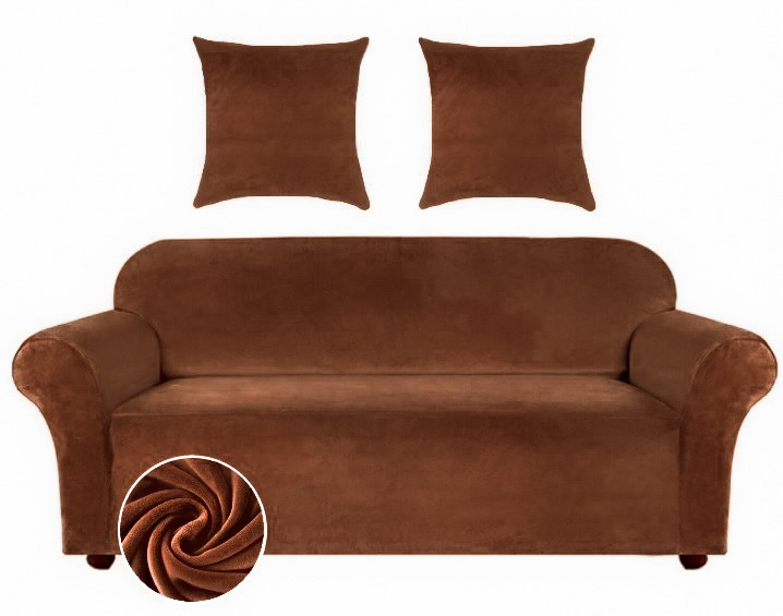 Ta oferta sprzedaży dotyczy pokrowca pasującego na kanapę (4-osobową) o szerokości w przedziale 235-300 w kolorze miedzianego brązu z dwiema poszewkami na poduszki (45×45 cm)